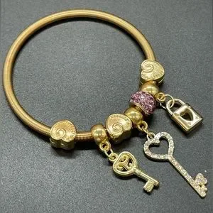 Gold Bangle Stretch Bracelet With Key Lock And Heart Shape Rhinestone Pendant