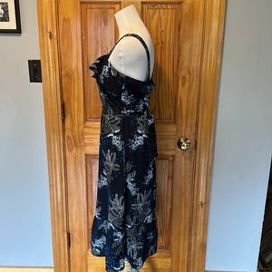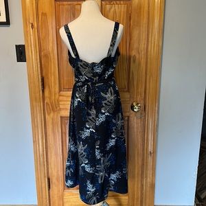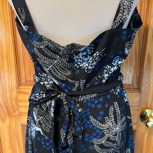 Banana Republic dress size 2 with black background and dark blue, light blue, white botanical print zip and tie in the back. Dress is in great condition.