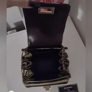 Presented in Chanel's 2.55 line, this metallic mini handbag/shoulder bag is fastened with the distinct Mademoiselle turn-lock, a characteristic exclusive to the models inspired by, or a part of the collection.
