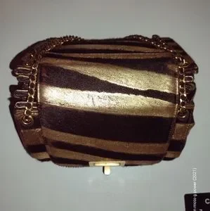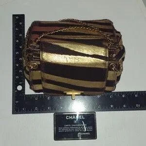 Chanel 2.55 Mini Mademoiselle Metallic Pony Hair Zebra Flap Bag featuring a distinctive expandable croissant shape, zebra-striped pony hair body and gold-tone Mademoiselle turn-lock.