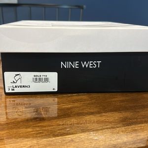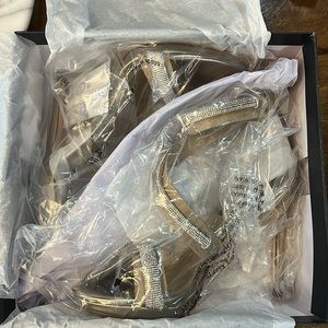 Nine West Lavern Women's Strappy Rhinestone Dress Sandals, size 7. Color "Platino" - similar to champagne/gold shade. 4.33" heel height, stiletto, open toe, back zip closure. Perfect dressy heel.