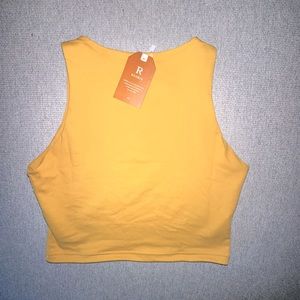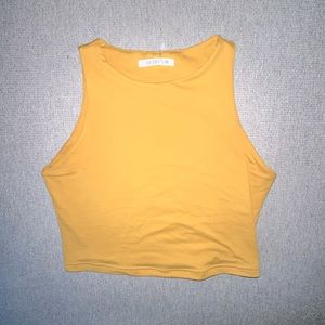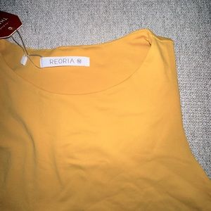 This is a mustard yellow cropped tank top from REORIA. The material is super stretchy and the shirt is a size large. It is sleeveless, razor back, and halter neck line. The material is 84% Polyester and 16% Spandex. It is doubled lined and not see through, so you can wear this without a bra. It serves as a sexy going out top or a perfect top for a casual day. There is no damage or tears, and in excellent condition! Never worn