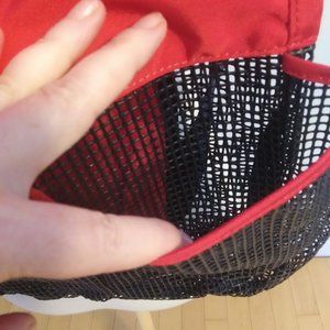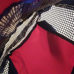 NWOT Lands End Kids rich red and black mesh beach bag. Has a musty smell from being in storage waiting for me to some day get to the beach again. Features: mesh , zipper front pocket. zipper inside pocket , adjustable straps for using as a back pack, draw string closure on top , several mesh type pockets on the front, tag inside says 100% polyester . Measures: ~ 16" x ~ 14". Mannequin dress form is a small. The clear plastic it came in is in okay shape.