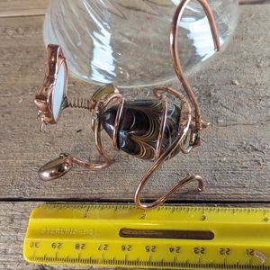 Whimsical wire sculpture of a kitty complete with bobble head. Glass face and paws, blown glass body wrapped with copper wire. Measures 4" tall and 4" wide from tail to front paws. So fun, can only bring a smile to anyone's face.