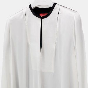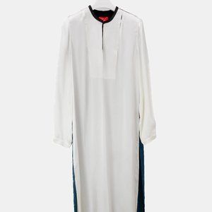 A long sleeve tunic dress from Lanvin’s 2012 Spring and Summer runway collection in slinky satin, featuring a White front and a deep Petrol teal back with a Black shoulder yoke and collar with raw, frayed edges, a keyhole bib neckline with a hook-and-eye fastening at the collar, subtle cut-outs at the shoulders, and deep side vents that run from hip to hem. Size: Unknown; tag removed. Condition: Very good; minor snagging on front right side and right sleeve, small stain on right sleeve, garment care tag removed. Approximate Measurements (Laid Flat): Shoulder: 15.75” (40 cm) Chest: 21.25” (54 cm) Length down back: 51.25” (130 cm) Sleeve: 26” (66 cm) Composition: 100% viscose.