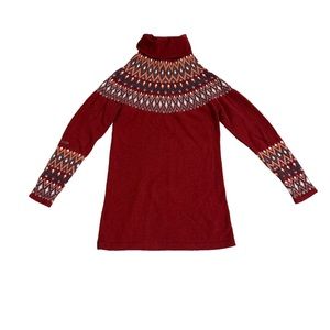 A knitted tunic with a colorful pattern reminiscent of a beautiful sunset. The tunic has a lovely warm high collar and pairs well with your favorite jeans or tights!