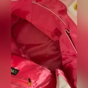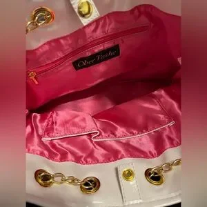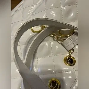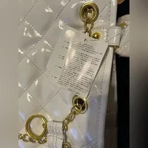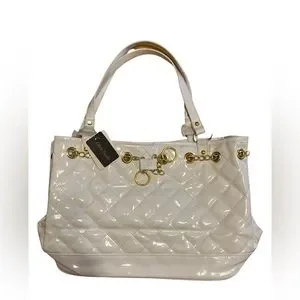 Item is brand new with tags but there is a dark scuff mark on edge of one of the handles and light marks from chains rubbing against vinyl on front of bag. All flaws in shown in photos