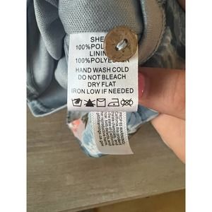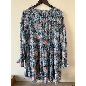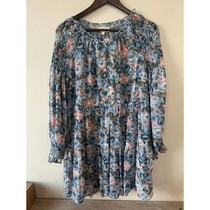Chiffon floral print tiered mini dress with button down closure, round ruffled neckline and smocked cuff long sleeves. True to size.