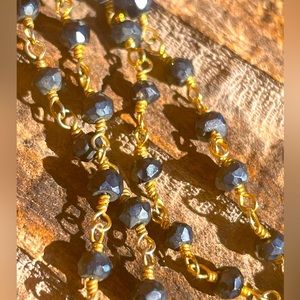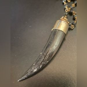 Liz Legg Bead and Horn Gold Necklace. Pre-owned. Marked on necklace 14/22 which is 14kt gold 22. Beautiful small black beads center this black horn pendant. Beads give off a nice sparkle- have hints of gray in sunlight. This piece is from her 2013 collection. Liz Legg is a Birmingham, AL based jewelry designer that creates edgy, organic jewelry that blends unfaceted stones and other natural objects. Her pieces have been sought after by celebrities. Liz Legg jewelry tag attached to necklace. Note: has alittle bit of wear on jewelry tag. The horn has some wear on the back of the horn. Please view all photos as they are part of the description. Approximate dimensions of necklace: 18 inches in length. Horn pendant measures alittle over 1 3/4 inch long x 1/3 inch wide.