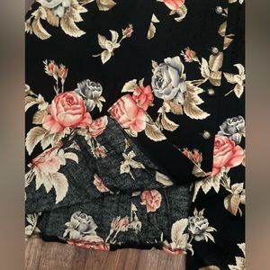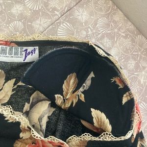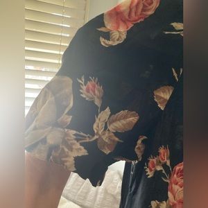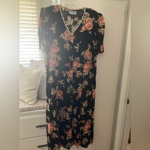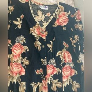Lovely flowy Fall roses and leaves 🍁Maxi.Does not have size tag. Please refer to measurements.Id say it is an 18W. 24” pit to pit. 29” Hip. Unique classy buttons .Looks brand new.Has shoulder pads.