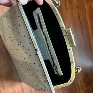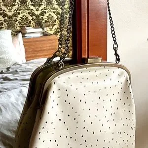An elegant clasp bag that has a unique look with vintage accents. Features a streamlined frame closure, with a generously sized main compartment and two inside pockets; an interior zipper pocket and a flat pocket.Thanks to the detachable shoulder strap, it can be worn on the shoulder or as a clutch.