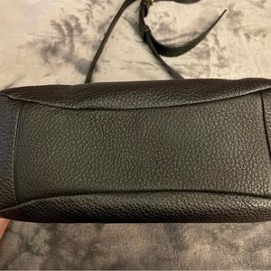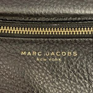 Leather black Marc Jacobs bag with gold detail. Bag has a magnetic closure, along with an outside pocket with locks, and an inside pocket. Strap is adjustable in length.
