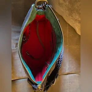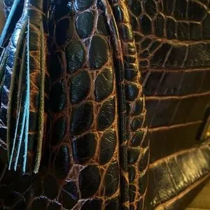 Dooney & Bourke rich brown croco embossed fino leather handbag. Green suede interior collar with key latch. Double tassels on both sides with zip top closer. New condition inside and out. Absolutely gorgeous bag.
