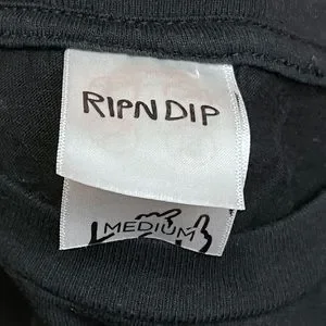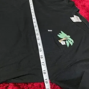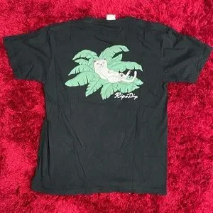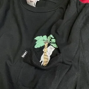 I’m selling a gently Used Ripndip Brand Short Sleeve Pocket Shirt In Black with a Cat Lounging print on the back and Cat with a Palm Tree in the pocket.