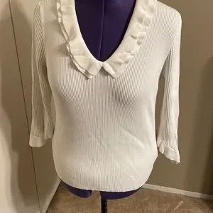 White ribbed, 3/4 sleeve, ruffled neck & sleeves sweater. 81% Rayon, 19% Nylon. Good Condition