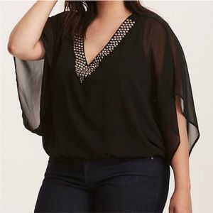 Smocked waist and full attached camisole underneath the chiffon overlay make this blouse flattering and comfortable. Silver studs at the neckline make this perfect for dressing up for a night on the town, an upcoming holiday party or just a day at the office.