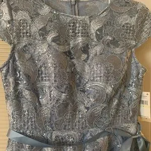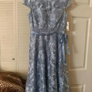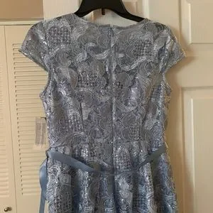 Alex Evening Women A-line Stretch Embroidered Dress with Tie Belt, Size 4, Sky Blue NWT.