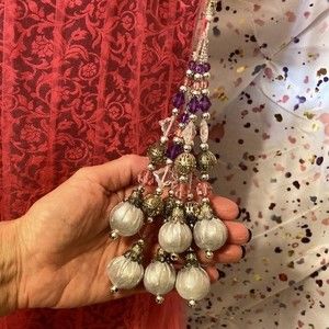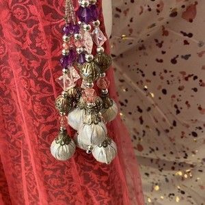 This custom made triple layered watermelon pink, black and silver skirt is truly one of a kind. Disk and beaded tassels and rhinestones bejewel this unique vintage skirt. Gorgeous detail and beadwork tassels like nothing you’ve ever seen before. This skirt came from a Broadway costume set, but details as to in which Broadway show it was worn are unclear. Please see photos because words don’t do this masterpiece justice. This skirt screams Cindi Lauper.