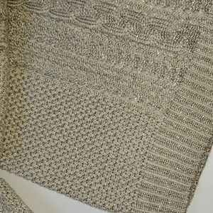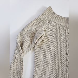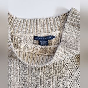Classic Ralph Lauren Sweater in a rich creamy beige color and blended with silver metallic flecks in fabric. Sweater is a heavier material, much prettier than pics. Signature cable knit with ribbed detailing at hemline, neckline & cuffs. Longsleeve, bataeu neckline (perfect for accenting a lovely necklace or drop earrings). This sweater is a pullover, longer in length style (see measurements). This would be an awesome sweater to wear during the holidays or to a festive event. A timeless, vintage piece that will never go out of style. (Used flash in last photo to try to capture the metallic flecks). Size Medium, good condition with very lite, gentle wear. Dry Clean.