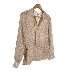 Excellent condition! Peach/gray/brown tones in a floral pattern. Chiffon. Long sleeves. Adjustable tie waist. V-neck. Size 4. 17” armpit to armpit. 24” length.