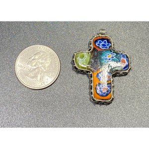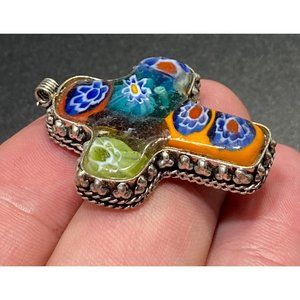 Made in Italy Murano colorful glass silver metal cross pendant. Floral flower pattern in orange blue green red.