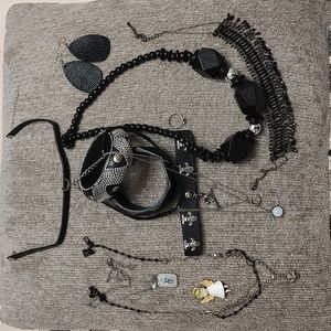 About 15 pieces of wearable Goth theme jewelry. Necklaces, bracelets, and earrings. Chokers, leather, skeletons/skulls, and metal! Would prefer to sell all together, but will take out individual items to bundle with another purchase at my discretion 😊.