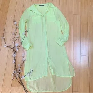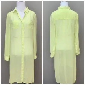 Long, sheet, yellow button up overdress, over shirt, Cover-up. Size extra small, could easily fit a small. This is sheer and meant to go over an outfit or even a bathing suit. Bust measures about 20 inches across, length in front about 37 inches, sleeve 23.5 inches. Excellent condition.