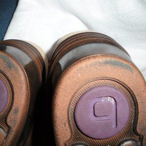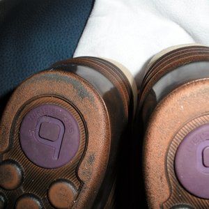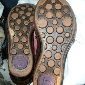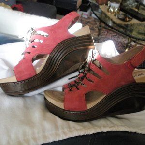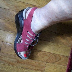 Bionicq designer sandals, lightly worn only once. Reddish suede cut out upper with brown and beige tie string which is just for looks. Fasten with back Velcro strap as shown in pictures. Suede is in perfect condition. foot bed and bottom have very slight signs of wear displayed in pictures.