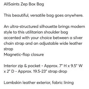 Great condition, soft lamb leather bag by All Saints. One chain strap and one wide strap comes with the bag. Dust bag included.