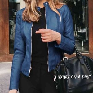 Chic Moto Vegan Leather Jacket Zip-up Sleek Snap Mock Neck Trendy Peacock Blue