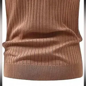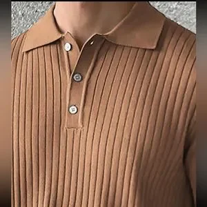 Brown / tan Men’s button v neck collared polo short sleeve rib knit shirt