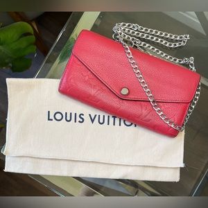 This Louis Vuitton Empreinte Sarah Wallet is preloved, but still beautiful. It has normal wear, but can easily be cleaned up. Nothing major at all. Please see all pics. I will include an unbranded chain so you can convert her to a shoulder/crossbody bag. Also included is a dust bag.