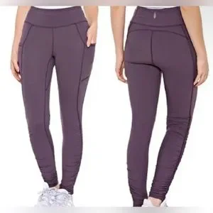 The Features: Breathable fabrication with four-way stretch, supportive waistband, slip pockets at sides, ruched detailing at both legs, flattering seam details