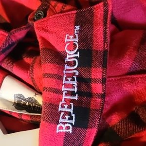 Red and Black Flannel features the wording BEETLEJUICE on collar, I MYSELF AM STRANGE AND UNUSUAL on the back, and a snap photo of two ghosts above front pocket