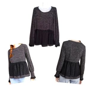 ANTHROPOLOGIE RO+DE Black/Gray Amirah Lace Long Smocked Cuff Sleeve Top XL