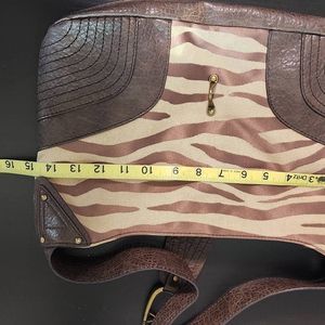 Jessica Simpson purse with cute J buckle. Features multiple pockets and a zipper closure. Man-made material in a dark brown color with a light and dark brown zebra print fabric. Brass-tone hardware. Great condition!