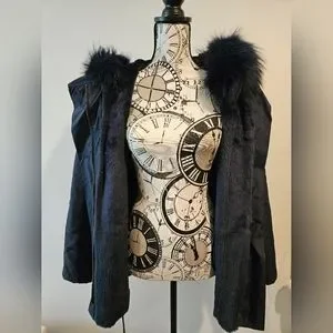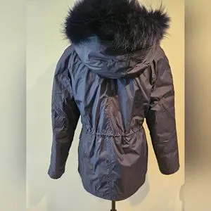 excellent condition, no stains or tears. Beautiful blue fur with light blue highlights. Fur on hood and entire fur lining inside of the jacket is removable for easy cleaning. Jacket has strings inside to sinch the waist line for a more fitted look.