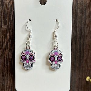 E1 - Halloween Pink Diamond Skull Earrings on 925 sterling hooks
