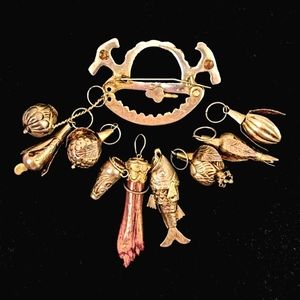 Vintage Penca de Balangandan 9 charms held together in a holder withvarious fruit and vessels charms, Image of 2 birds facing each other with a detailed arch. There is a removable screw to open holder. It is in good condition, consistent with age and use.
