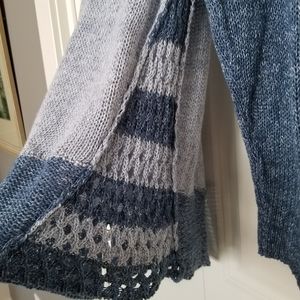 Chico's blue crochet knit back long sleeve sweater with asymmetrical hemline. Cotton blend. Chest 40 inches. Gently worn in good condition from non-smoking home.