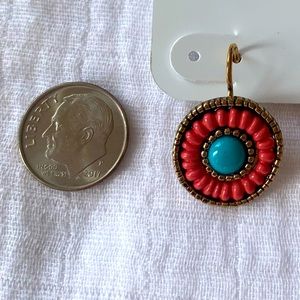 Gold tone and coral pink circle with a turquoise center.