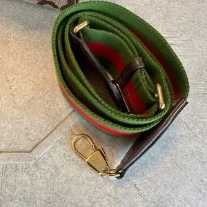 This chic tote is crafted of ebony on beige jumbo GG monogram canvas and brown calfskin. It features brown leather top handles and trim, and an optional green and red canvas shoulder strap with gold hardware. The top opens to a natural fabric interior with a flat pocket.