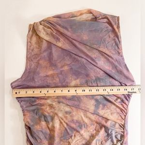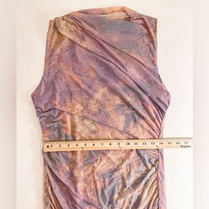 Sleeveless high collar mini dress. Contrasting inner lining. Ruching
