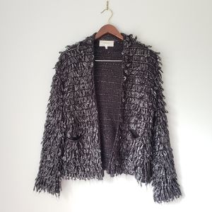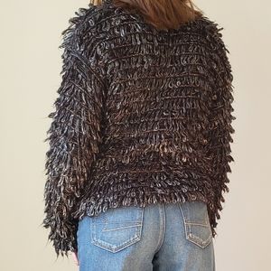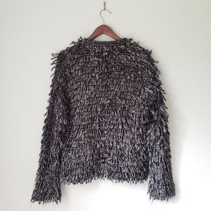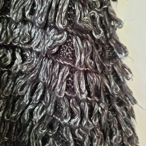 Details: This loop-knit sweater is soft, textured and hits right below the waist. Plush looped yarn creates touchably soft texture and cool dimension. Metallic charcoal color. 60% polyester, 40% acrylic.