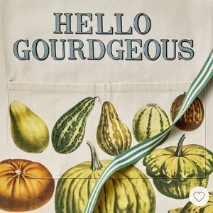 27in x 34in fall-themed kitchen apron Features text "Hello Gourdgeous" and print of various colorful gourds