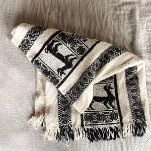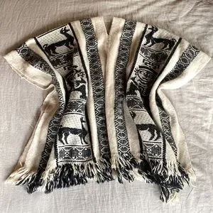 Awesome pure wool coverup in excellent condition. Black Aztec design on natural cream. Thick and warm…perfect for layering over denim or linen. Freshly laundered.