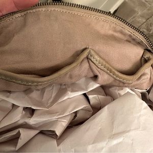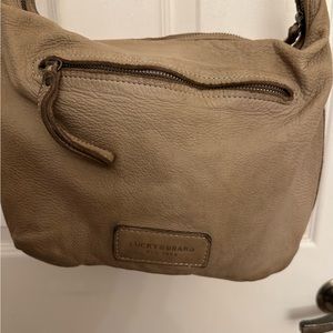 Lucky Brand 100% Taupe/Light Brown 100% Leather Crossbody. It was professionally cleaned. I believe it was dyed naturally to bring out the hide. Very Unique. It is approximately.9.5” in height, approximately 14.5” wide at the widest point and approximately 5.5” in depth. The strap is adjustable. It has 1-zippered exterior pocket, 1-zipped interior pocket. 2-open pockets one for a phone and one for keys or a smalll wallet. Beige lining.