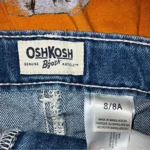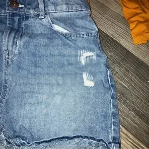 Long sleeve pumpkin colored top with mason jar graphic and sequins floral arrangement. Medium wash fake destroyed denim skirt with pockets in front and back, belt loops and adjustable elastic waistband