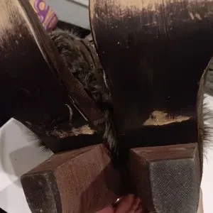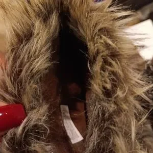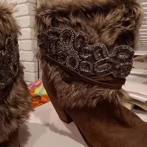 dark brown suede booties with faux fur top embellish with clearance silver colored beads 3.5 in heel
