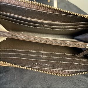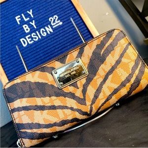 Tiger stripe Michael Kors zip around long wallet in excellent condition. Aside from the scratches on the nameplate, the wallet is pristine & has the original hardware. The wallet is large enough to fit a phone so if u want to add a wrist strap, it could easily be converted to a wristlet. #MK #MKwallet